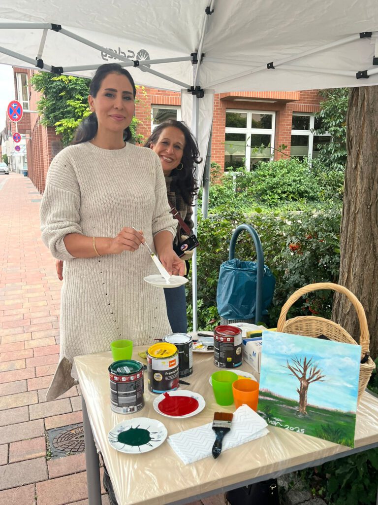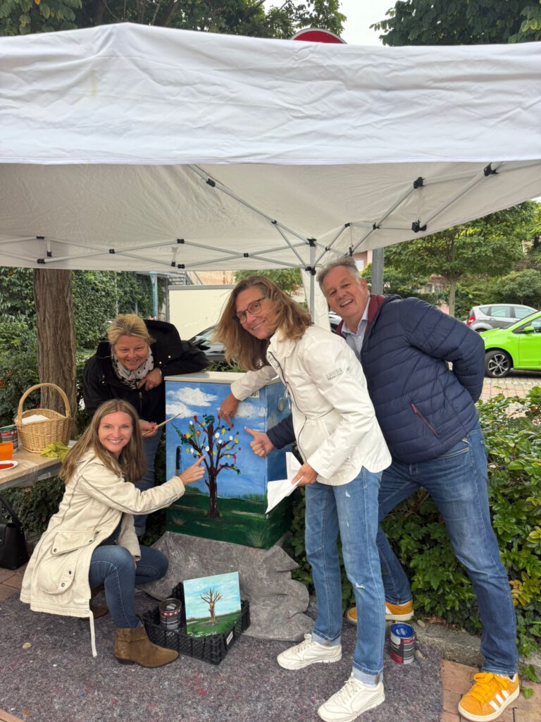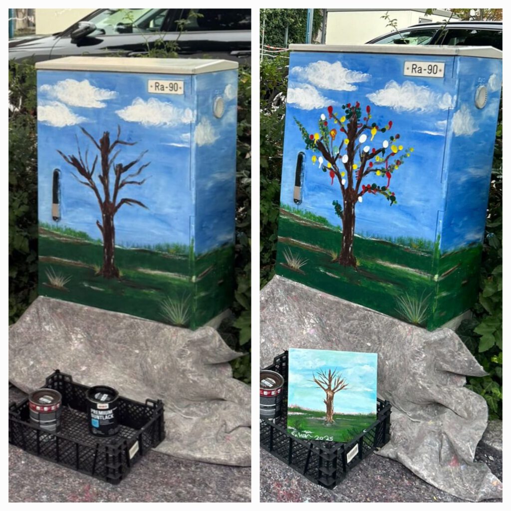 Am Dienstag, den 23. September 2025, kamen Mitglieder des Kunstvereins Hockenheim sowie Personen des Asylnetzwerkes zusammen, um einen Stromkasten kreativ zu gestalten. Auf diesem entstand ein Baum als Symbol für Neubeginn und Leben. Seine Blätter wurden durch Fingerabdrücke der Teilnehmenden hinzugefügt. Koordiniert wurde die Aktion durch die Integrationsbeauftragte Petra Grabs und der „AG Stromkästen“ (Birgit Rechlin, Dagmar Kramberg und Bärbel Hesping) des Kunstvereins Hockenheim.